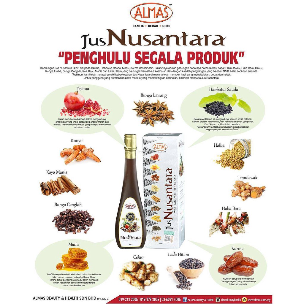 Jus Nusantara diperbuat daripada 100 ibu pati herba asli semulajadi. Home Wellness Health Supplements Almas Jus Nusantara Gold 500ml. Jus Nusantara Almas diperkaya dengan rumusan bahan botani yang menyimpan 1001 khasiat bagi mengatasi pelbagai jenis penyakit kronik yang menjejaskan tahap kesihatan.